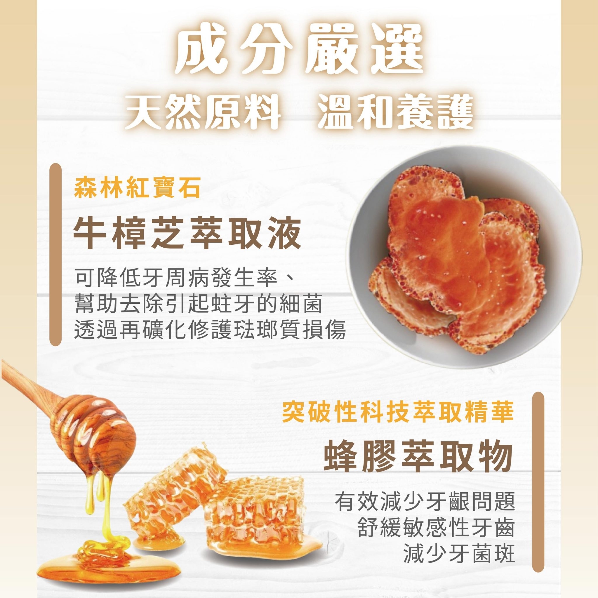 含突破性科技萃取之蜂膠及森林紅寶石之稱的牛樟芝等配方
